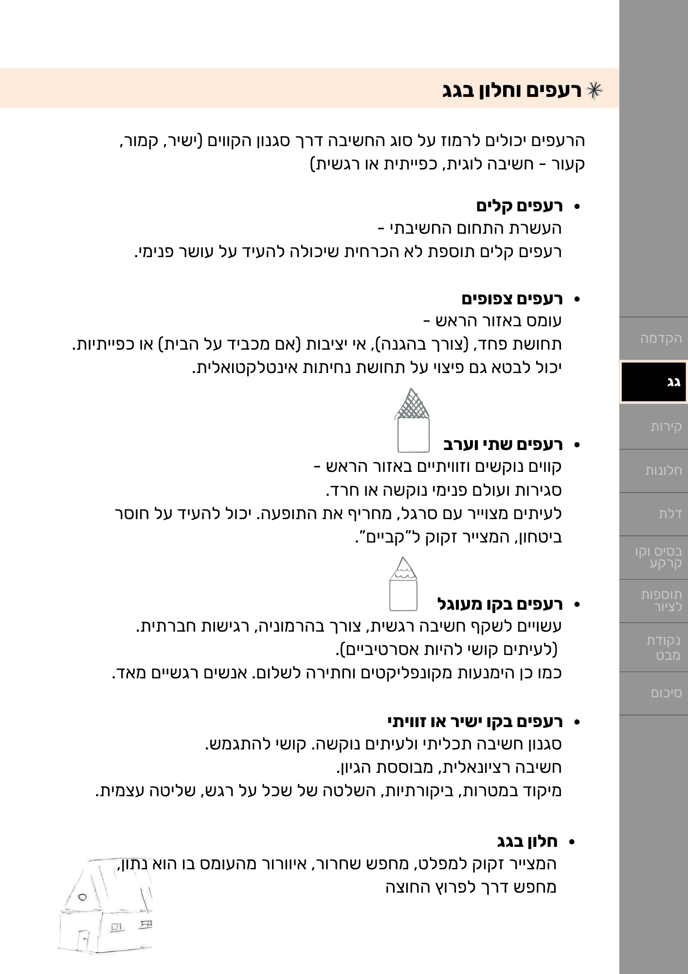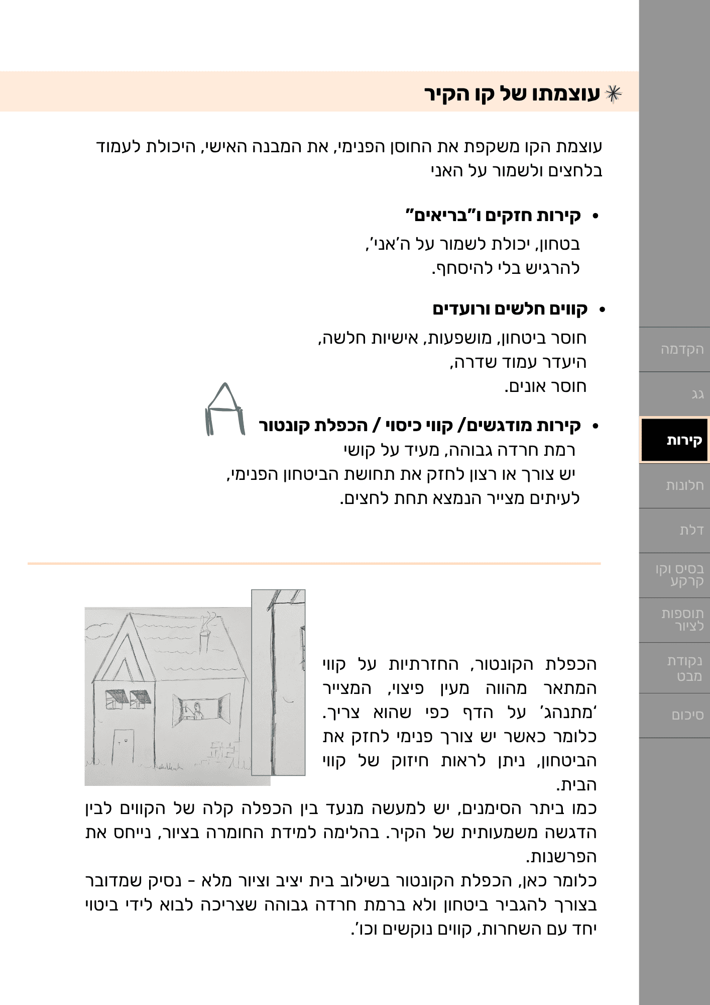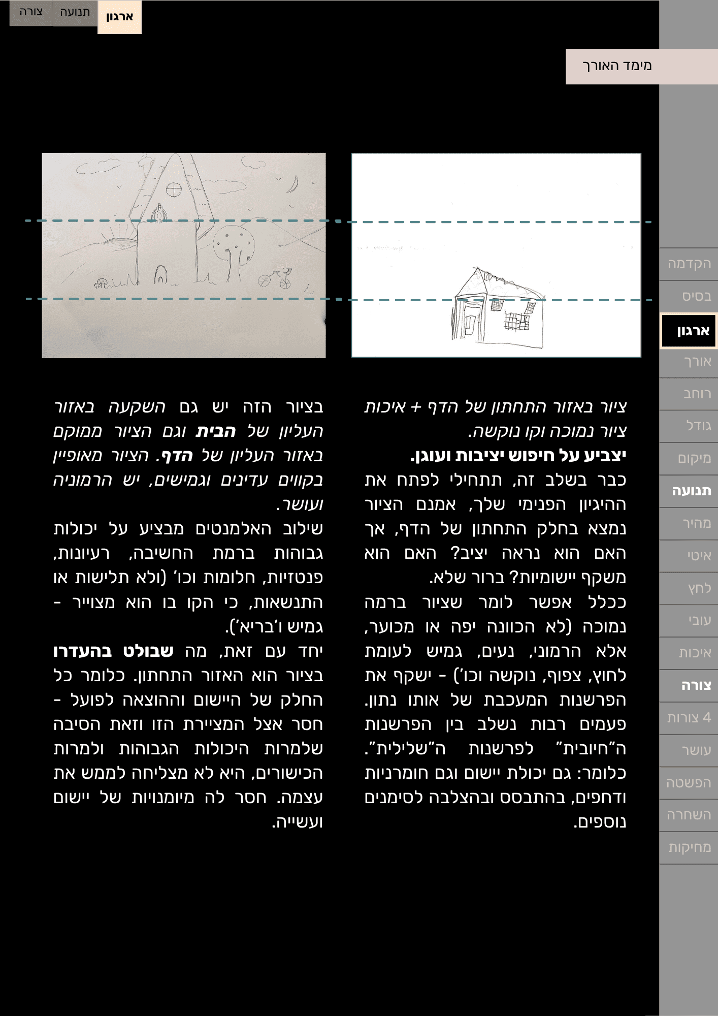 - להבין את המשמעות של כל חלק בציור: גג, קירות, דלת, חלונות, שביל, גדר, תוספות ועוד
